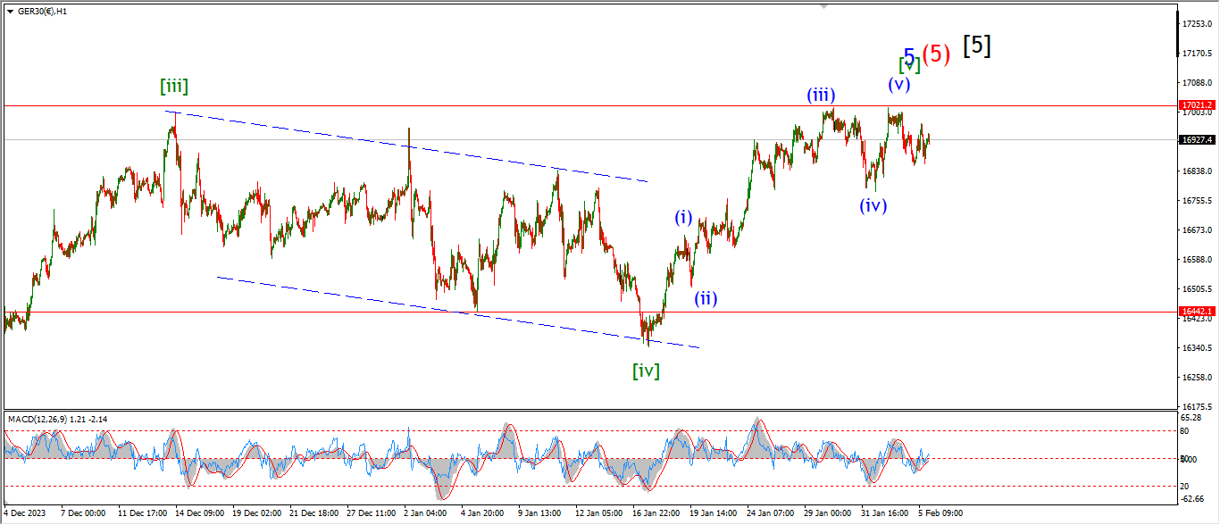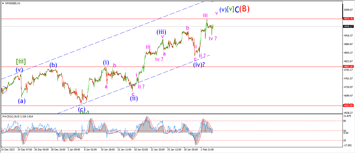 Watch for wave (v) to complete five waves up at a new high tomorrow.