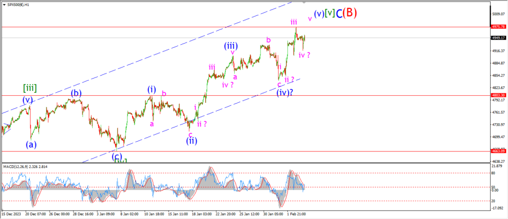 I have shown a possible five wave pattern higher in place for wave (i) at todays highs.