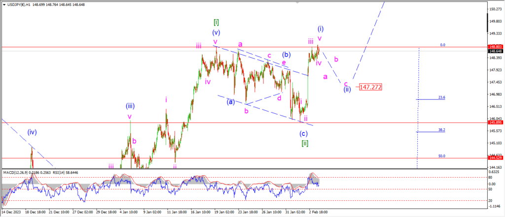 Watch for wave (ii) to turn lower and drop towards the 147.00 level over the next few days.