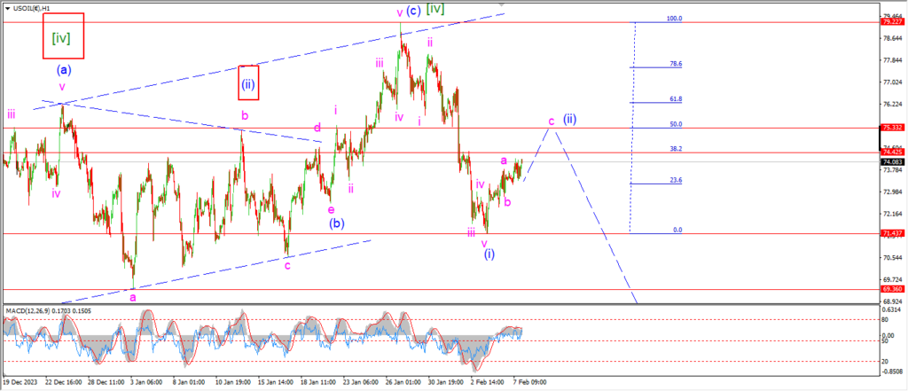 Watch for wave ‘c’ of (ii) to close out with one more push above 75.00.