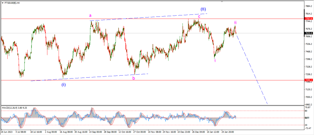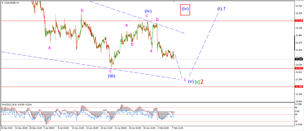 Watch for wave ‘c’ of (v) to make a new low for the pattern with a break of wave (iii) at 21.92.