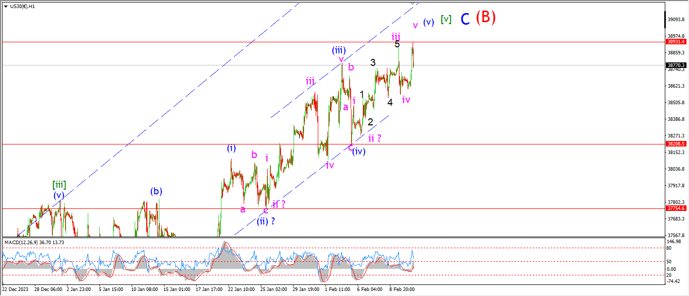 There will not be any confirmation of these counts until the market decides the trace back below the wave (iv) low at 38200.