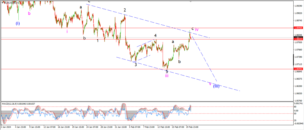 The spike higher today did come close to breaking the invalidation level at 1.0846 at wave ‘i’.