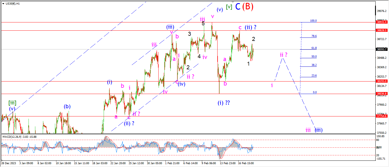 A move back below 38000 again will signal wave (iii) is in play.