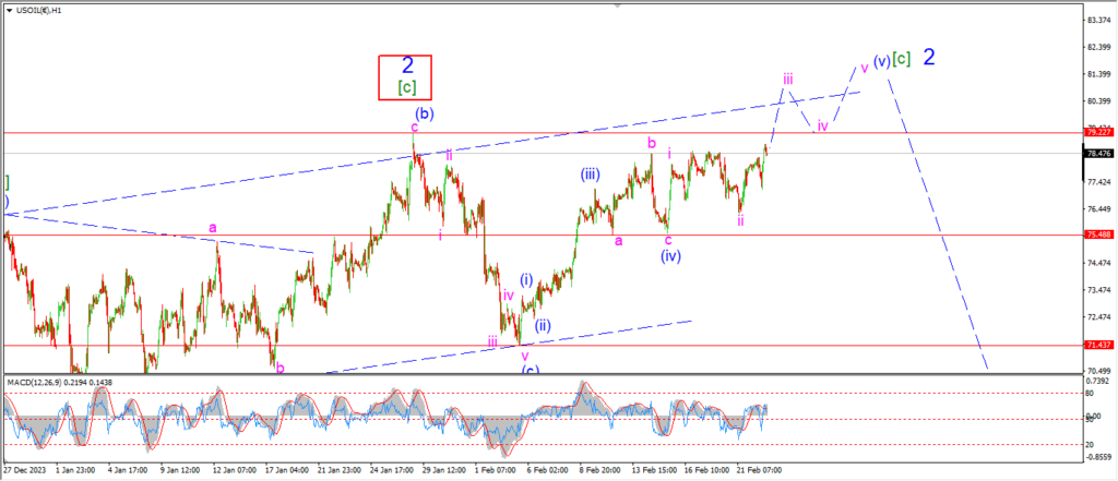Crude oil is holding below the highs at 79.22 again today and the wave count for wave (v) remains unfinished.