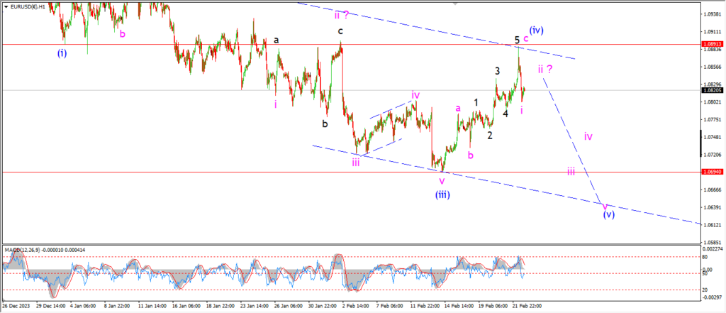 The price dropped off sharply in wave ‘i’ of (v) and this wave should continue lower to break 1.0690.