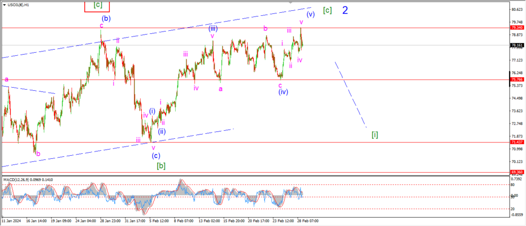 Watch for a decline back below wave (iv) again at 75.76 to signal the price has topped in wave ‘2’.