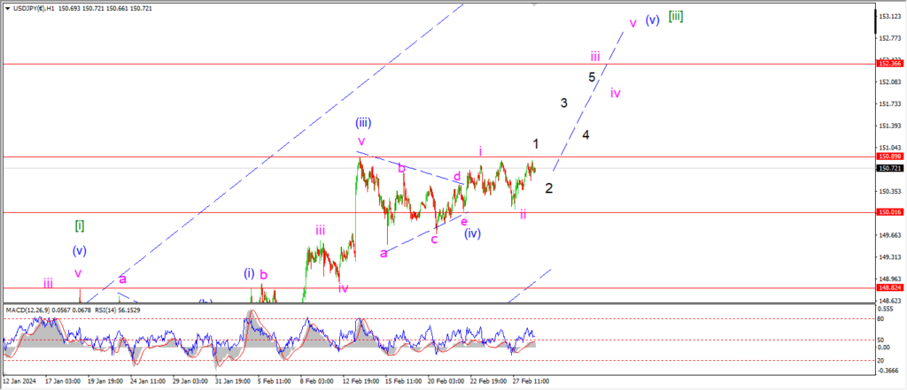 Wave ‘iii’ of (v) should continue higher tomorrow and break out above the wave (iii) high at 150.89 to confirm this pattern.
