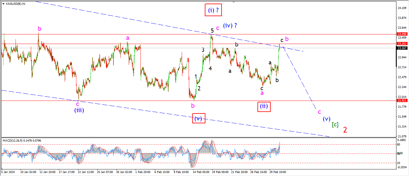 A rally in silver today as pushed the wave count slightly for wave ‘b’ of (v).