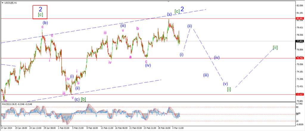 Crude has fallen enough today to rule out last nights count and to now consider the possibility that wave [c] and wave ‘2’ are now complete at this weeks highs at 80.48.