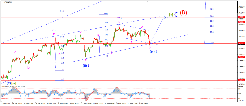 Three waves down in wave (iv) is holding at todays lows of 38450.