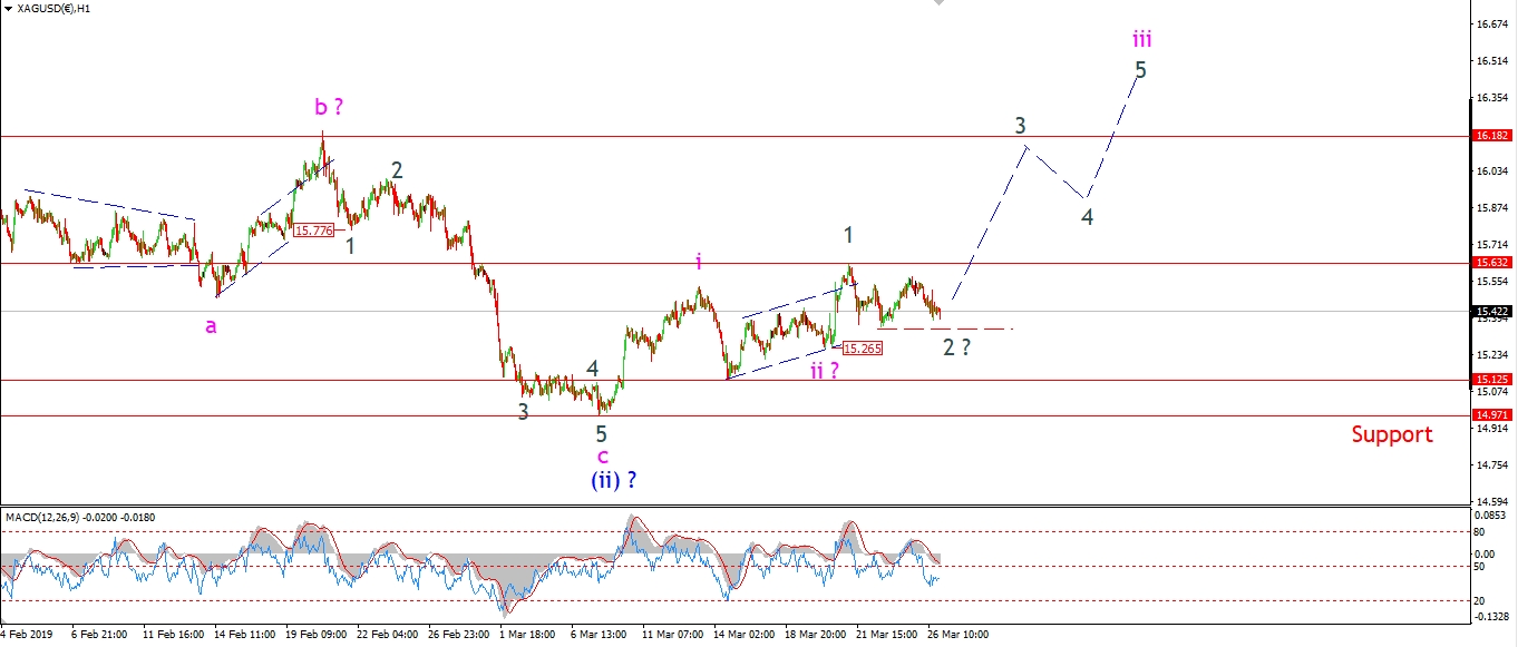 Silver is dropping slowly this evening as a final leg down to complete wave ‘2’ of ‘iii’.