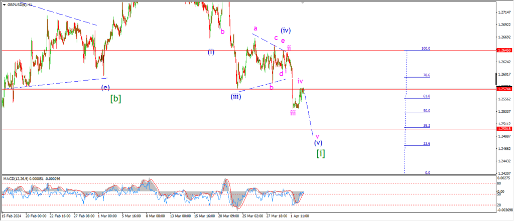 Watch for wave (v) of [i] to complete the decline with a break of 1.2500 and then we can look for a turn higher into wave [ii].