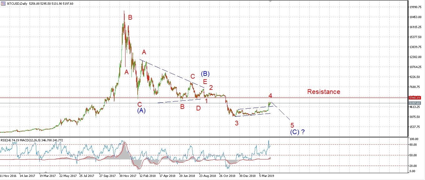 The price is approaching serious resistance now between 5600 – 5900. So there is a solid potential that bitcoin is going to roll over again into a fifth wave.