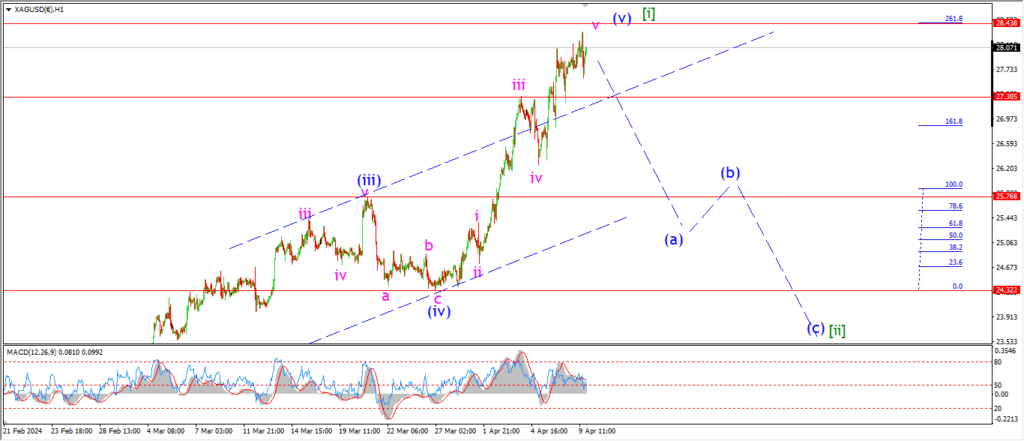 Watch for a break of the wave ‘iii’ high at 27.30 to indicate a turn lower into wave (a) has begun.
