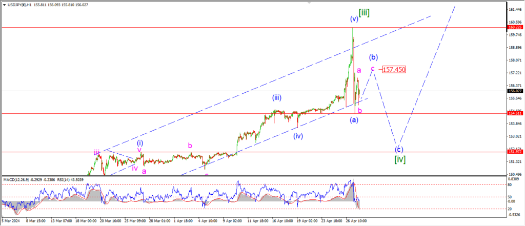 Watch for wave (b) of [iv] to complete three waves up near 157.50 as shown.