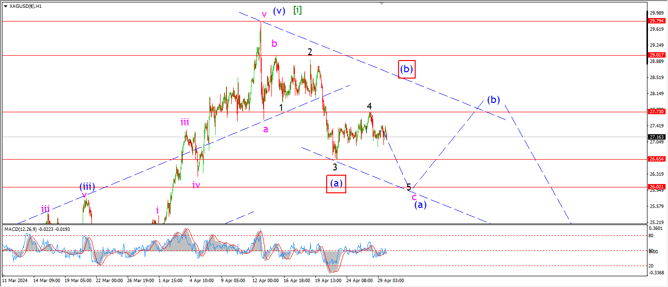 The alternate count for wave (b) will be triggered if the price breaks above the wave ‘4’ high at 27.73 again.