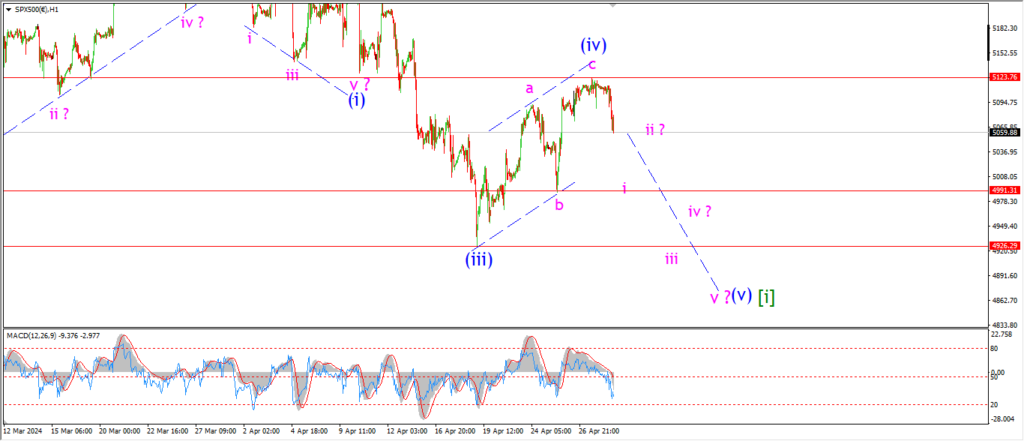 Wave (v) down must continue lower in five waves as suggested with a minimum target at 4926 at the wave (iii) lows.
