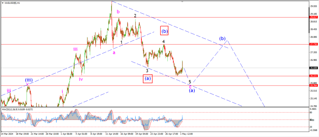 Watch for wave ‘5’ of ‘c’ to complete a three wave decline into wave (a) by tomorrow evening.
