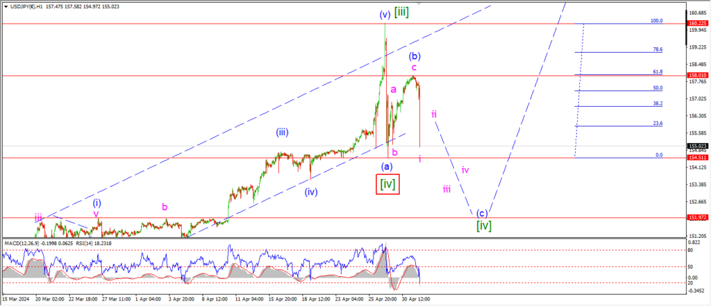 WAve ‘i’ of (c) should fall into the wave ‘b’ lows near 155.00 to confirm the main count for wave (c) of [iv].
