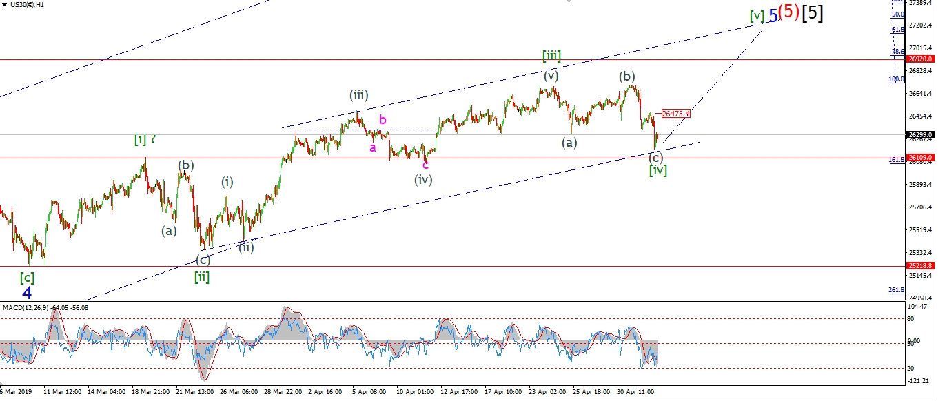 Watch for price to hold above 26109 and for wave [v] to begin with a spike above 26470 again.