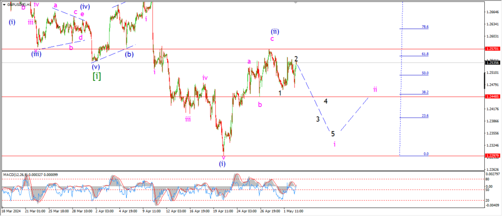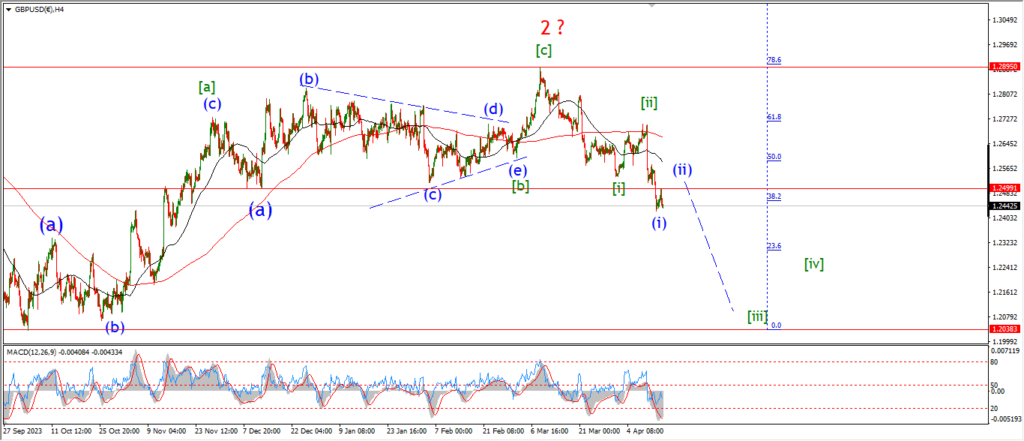 Wave ‘i’ of (iii) must turn lower and trace out five waves down to break the 1.2400 level.