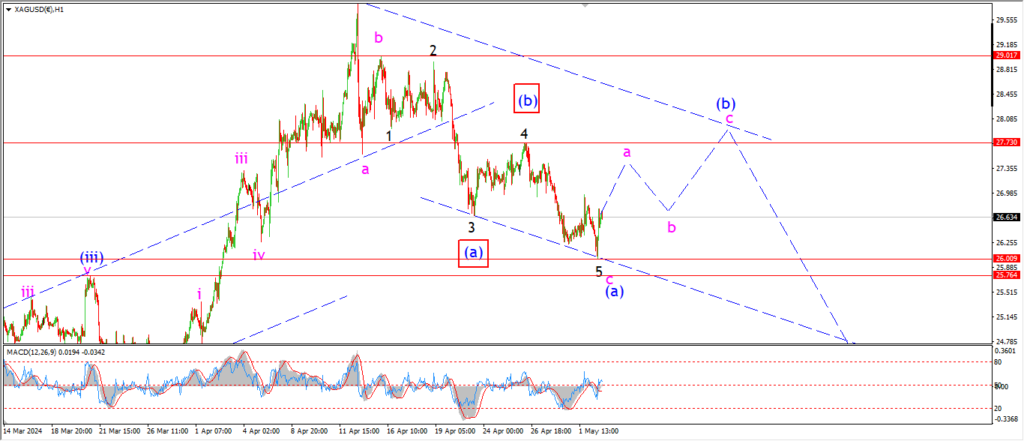 Wave ‘a’ of (b) will trace out three waves up and hit the 27.70 area early next week.