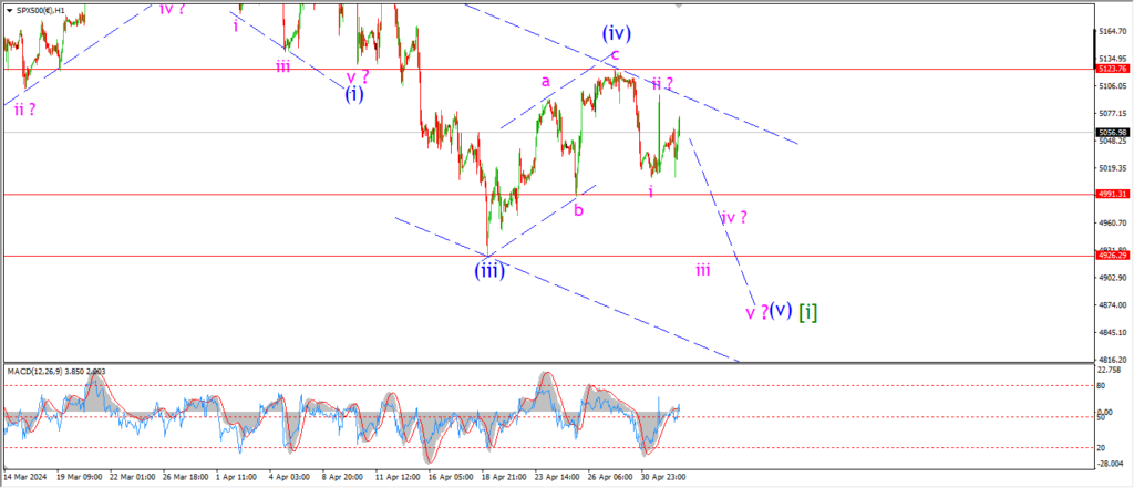 A break of the wave ‘b’ low at 4990 will signal wave ‘iii’ of (v) is underway.