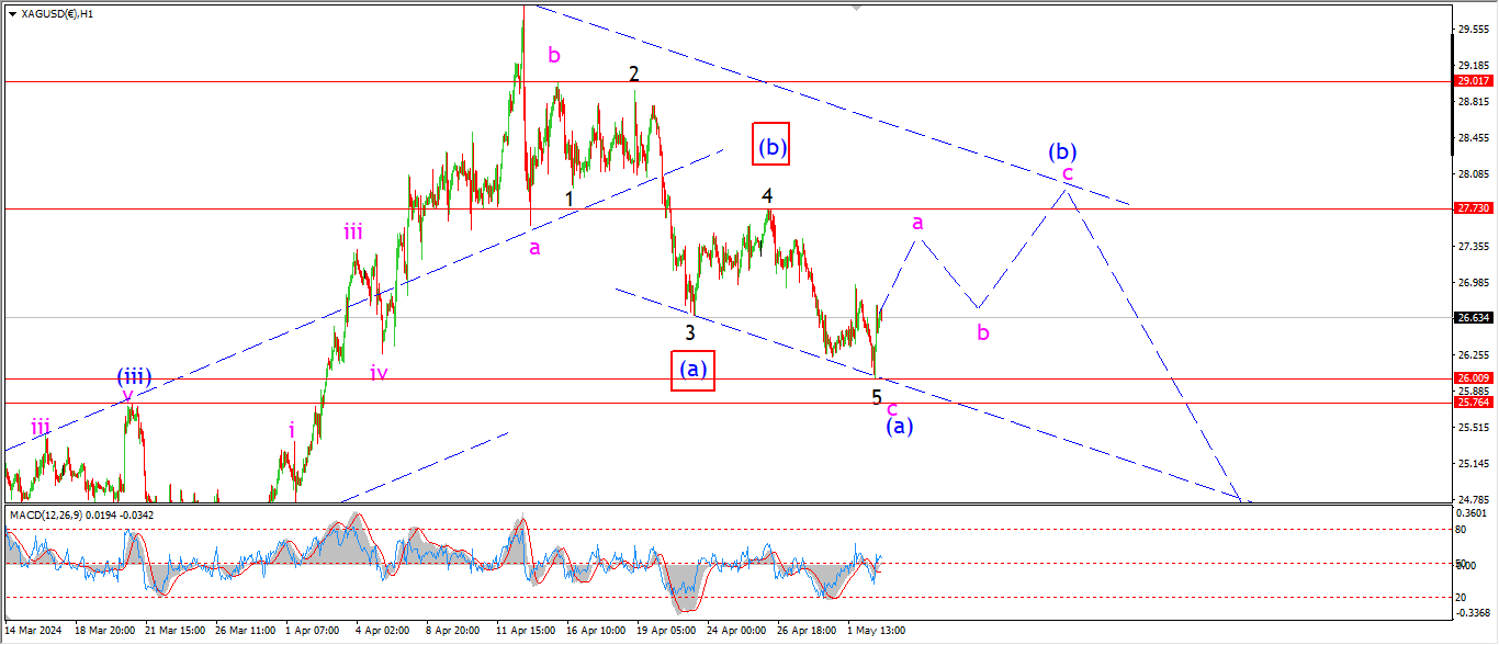 Wave ‘a’ of (b) will trace out three waves up and hit the 27.70 area early next week.