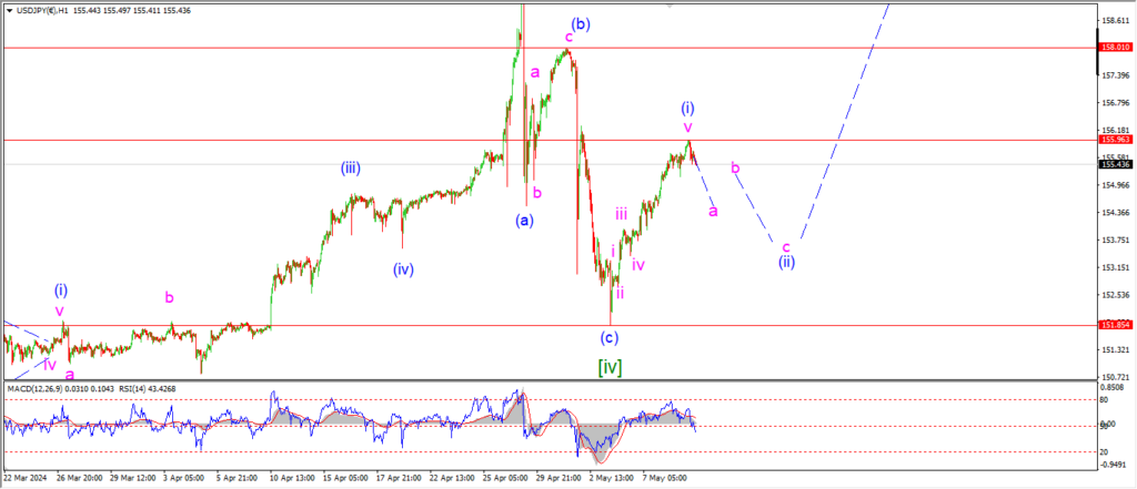 Wave (i) seems to have finally topped out at todays highs and the price is showing weakness off to top at 155.96.