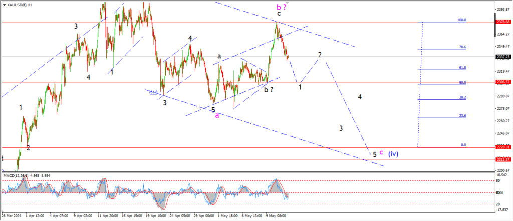 gold is beginning to move lower in an impulsive manner today which adds to the idea that wave ‘b’ is complete at 2378.