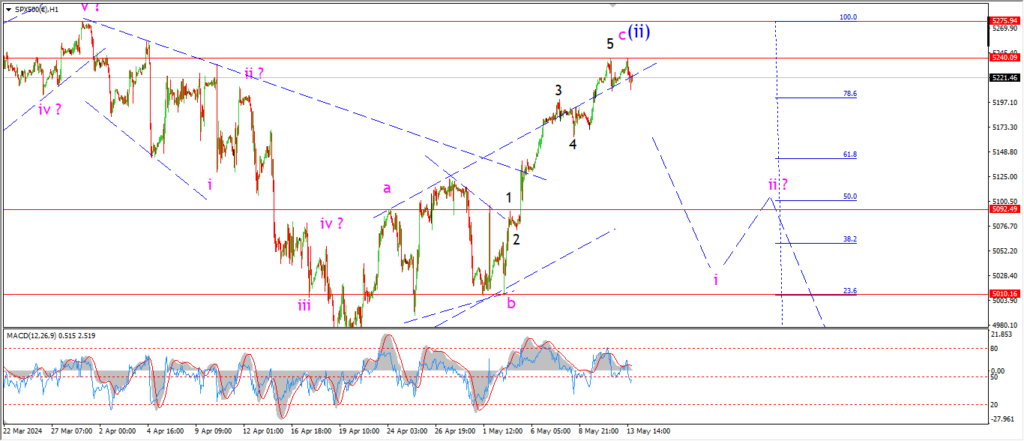 A slightly weaker session today but there is no confirmation of a reversal into wave ‘i’ yet.