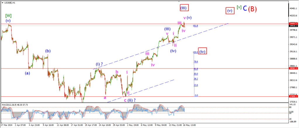 The S&P has traced out another small five wave pattern into this weeks highs to close out wave ‘v’ of (iii).
