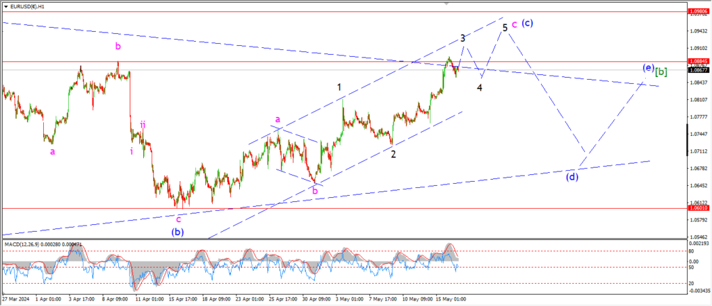 Watch for wave ‘3’ to close out with a run up to 1.09 and then wave ‘4’ of ‘c’ will correct again back towards 1.0850.