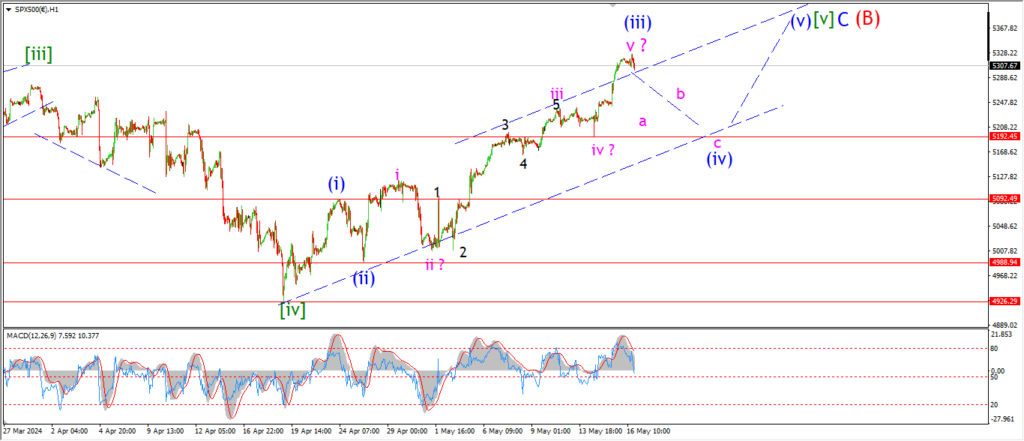 Wave (iv) should now take over and fall in three waves back into the previous wave ‘iv’ lows at 5190 again.