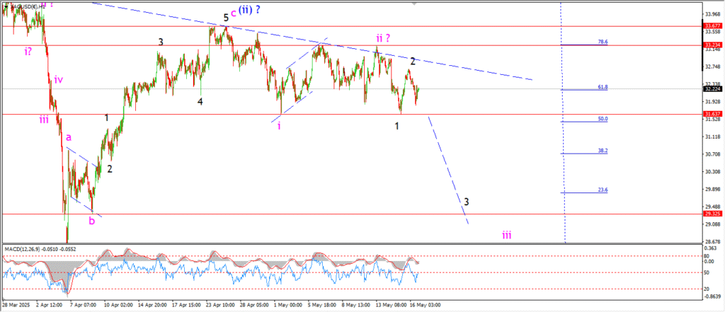 Silver continues to trade in the range with the price holding above the wave ‘i’ lows again tonight.