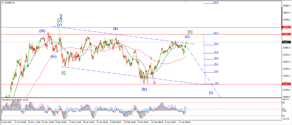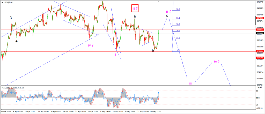 I am expecting wave ‘c’ of ‘ii’ to hit 33800 to complete.