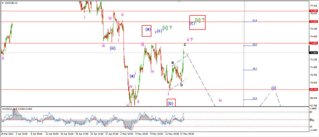 The alternate count for wave [ii] green is still a possibility here and if the price breaks above 73.80 again that count will be triggered.