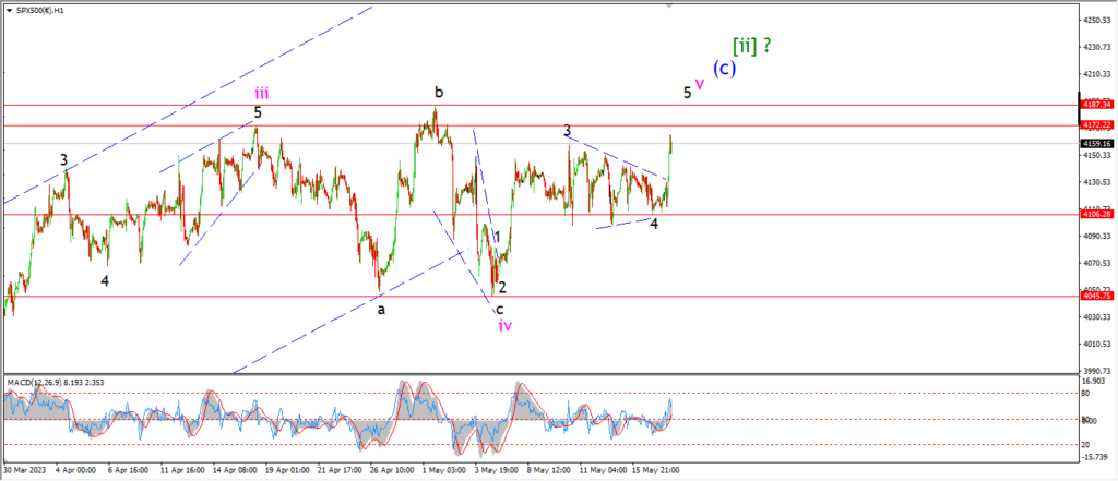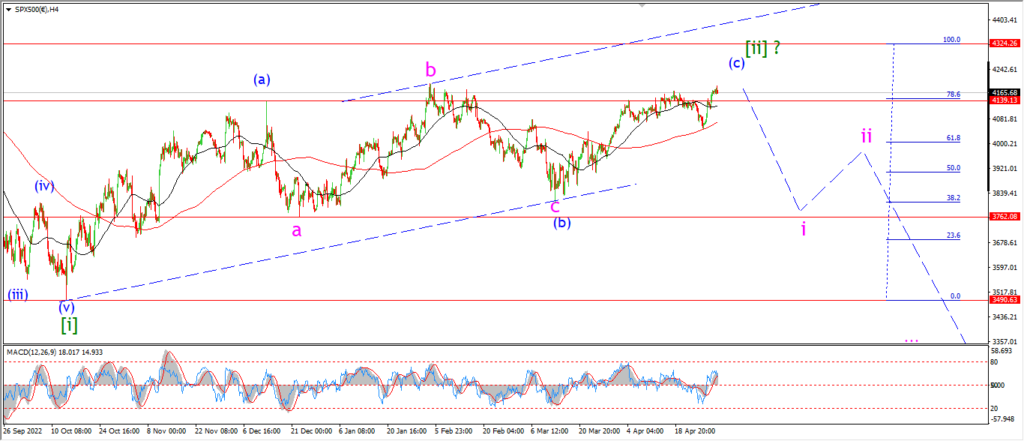 Watch for wave ‘5’ of ‘v’ to break 4172 and then top out soon after to complete five waves up in wave ‘v’ pink.