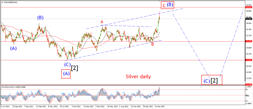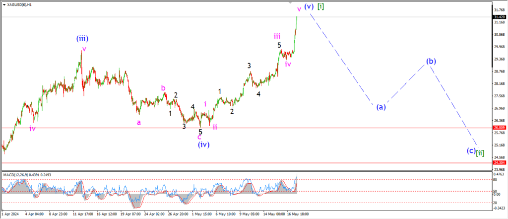 A break back below the wave (iii) high at 29.79 will signal wave (A) of [ii] has begun.