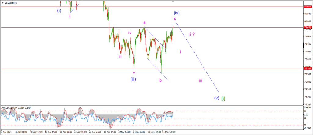WAtch for wave ‘c’ of (iv) to complete below 81.00 and then wave ‘i’ of (V) should drop back below 79.00 again.