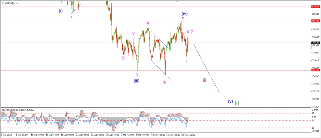 The idea here is that we get a five wave decline back below 76.00 in wave (v) of [i].
