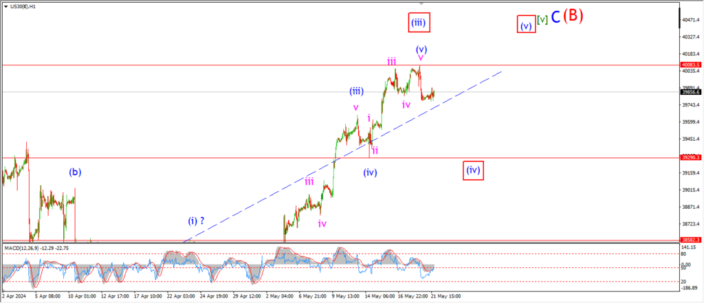 Watch for a decline into wave (iv) at the very least to hit the initial support at 39290.