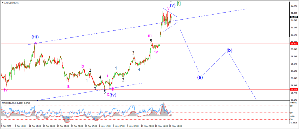 The price declined in three waves today and that action has created a higher low this evening and I have labelled that wave ‘2’ of ‘iii’ to the upside.