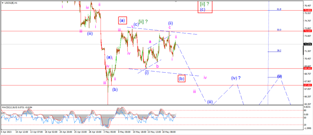 The alternate count for wave [ii] is suggests that wave (b) of [ii] is now closing out with a drop below 69.30 again.