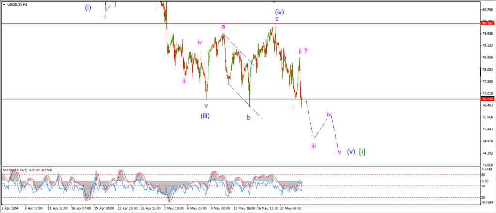Watch for wave ‘iii’ of (v) to drop towards the 75.00 level and then a correction in wave ‘iv’ should consolidate below 76.00.