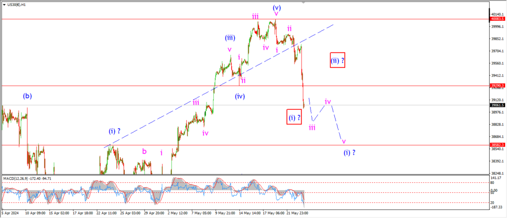 Watch for a five wave decline in wave (i) to hit the support at 38582.