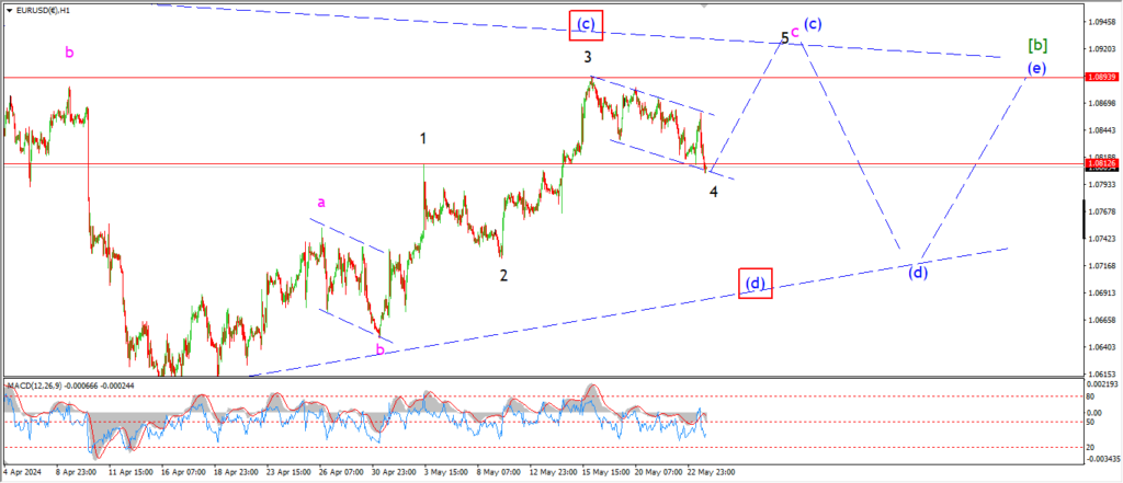 Watch for wave ‘5’ of ‘c’ of (c) to turn higher and complete with a break of 1.0893.