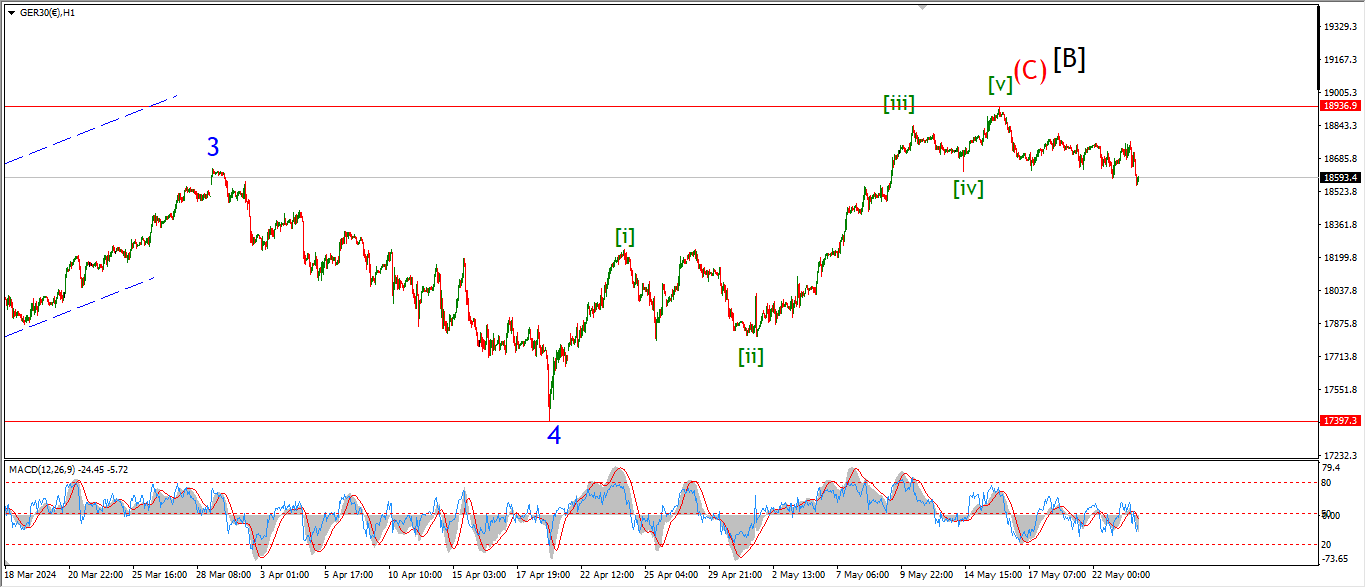 Watch for a five wave decline in wave (i) to hit the support at 38582.