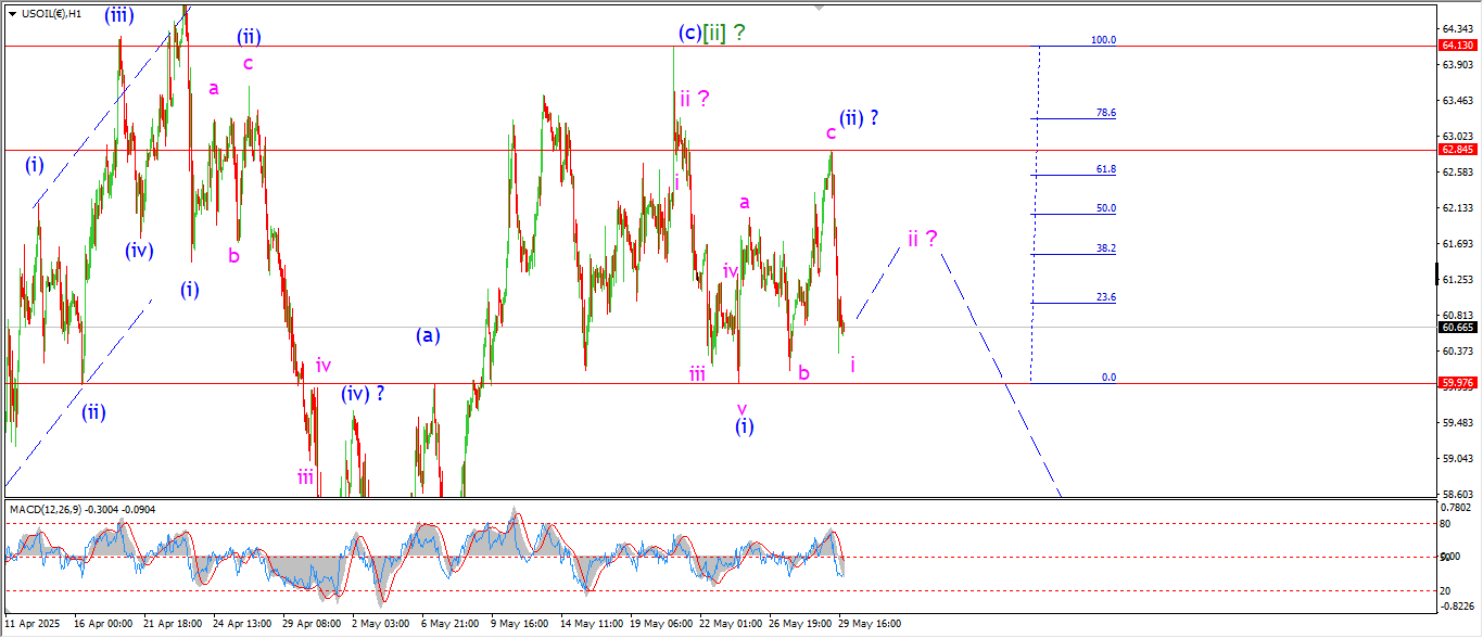 Crude oil has fallen back off that wave (ii) lower high today with quite a sharp move.